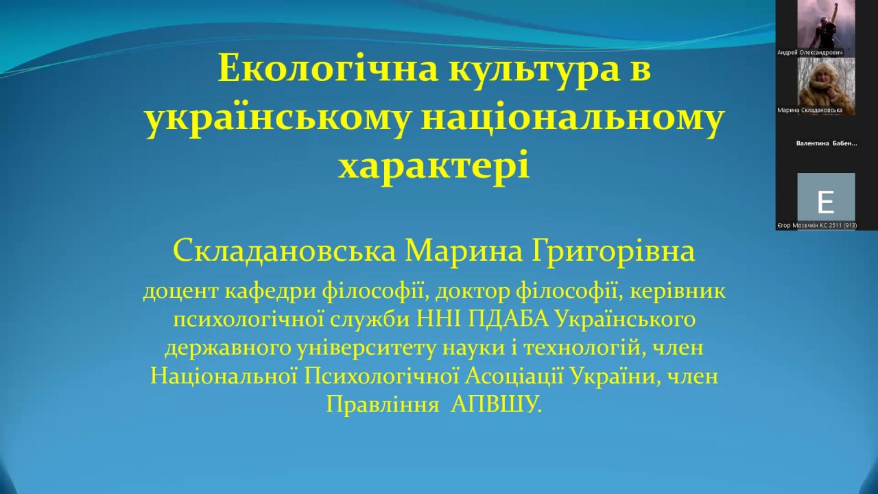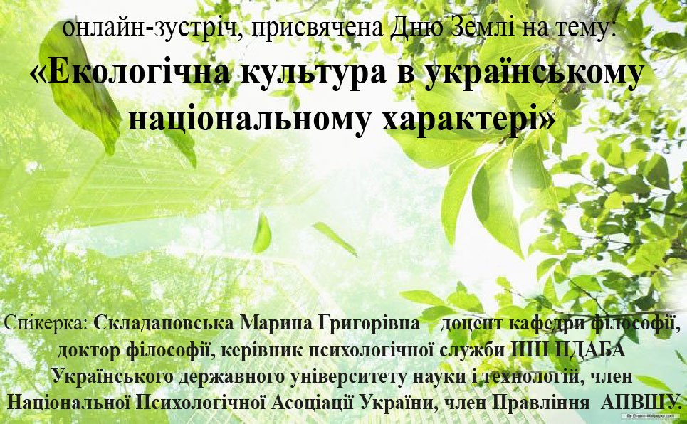 26 березня, у межах циклу національно-патріотичних лекцій «Незламність Української нації: історія та сьогодення» студенти й куратори, викладачі з усіх факультетів ННІ ПДАБА УДУНТ та усі охочі змогли долучитися до осмислення екологічних проблем людства на онлайн-зустрічі, присвяченій Дню Землі на тему: «Екологічна культура в українському національному характері»