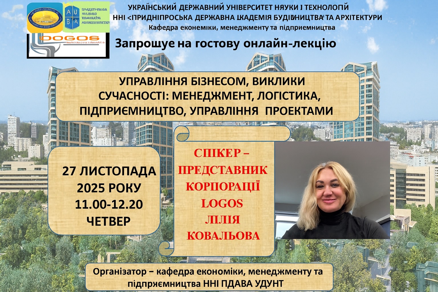 Запрошуємо на гостьову онлайн-лекцію «Управління бізнесом, виклики сучасності: менеджмент, логістика, підприємництво, управління проектами», яка організовується в межах спеціальностей D3 «Менеджмент» та D7 «Торгівля» (ННІ ПДАБА, ННІ УДХТУ, ННІ ДІІТ, ННІ ДМетІ) та співробітництва Корпорації LOGOS (м. Дніпро).