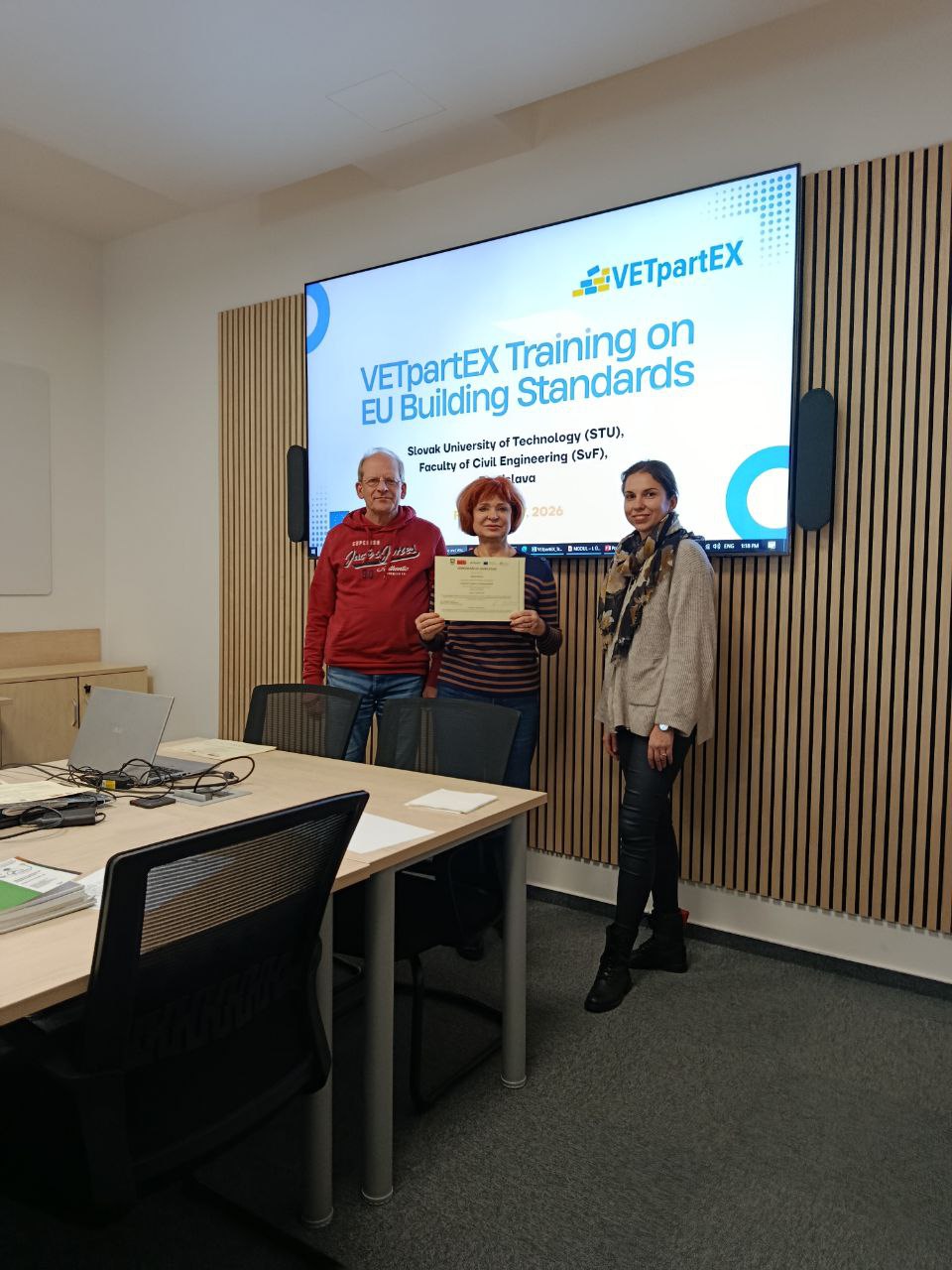 З 9 по 17 лютого 2026 року у Словацькому технологічному університеті у м. Братіслава на факультеті цивільного будівництва відповідно до плану реалізації міжнародного проєкту «VETpartEx – Майбутньо орієнтована професійна освіта для будівельного сектору України» за програмою Erasmus+ KA2 відбулося стажування за темою «Будівельні стандарти Європейського Союзу», у якому взяли участь викладачі Українського державного університету науки і технологій – кандидати технічних наук, доценти ННІ «Придніпровська державна академія будівництва та архітектури» Анастасія ГАЙДАР, Олена КОВАЛЬ, Євген ЮРЧЕНКО, Олександр ТРЕГУБ (онлайн).