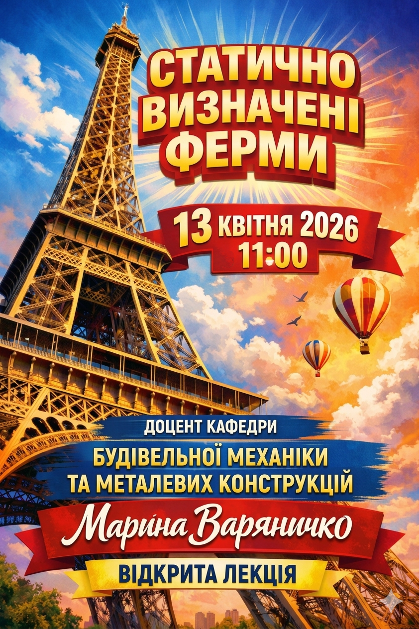 13 квітня 2026 р. об 11-00 відбудеться відкрита лекція доцента кафедри будівельної механіки та металевих конструкцій Варяничко Марини Олександрівни  на тему: “Статично визначені ферми” для студентів груп ПЦБ 24-1-2-3-4-5.