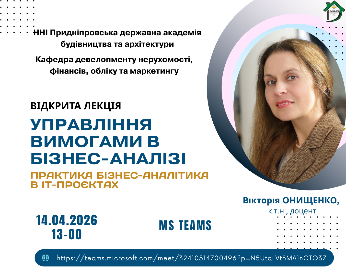 14 квітня 2026 року об 13.00 відбудеться відкрита лекція доцента кафедри девелопменту нерухомості, фінансів, обліку та маркетингу Вікторії ОНИЩЕНКО з теми «Управління вимогами в бізнес-аналізі» для студентів групи МАГ-22, ФІН-22.